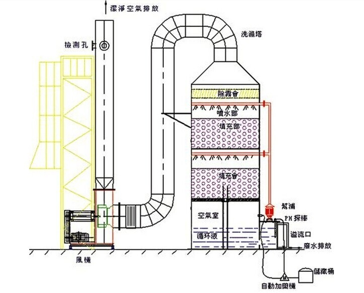 本工藝所采用的填料式吸收法就是利用增大氣液兩相的接觸面積來提高效率的,當(dāng)粉塵/廢氣/油霧與藥水液體大面積的接觸后,廢氣中的污染物被藥水液體吸附、吸收,從而與潔凈氣體分離,達(dá)到凈化的目的。