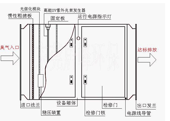 高效光解氧化處理模塊利用高能UV紫外線光束裂解惡臭氣體中細菌分子鍵,破壞細菌的核酸(DNA),再通過臭氧進行氧化反應(yīng),徹底達到脫臭及殺滅細菌的目的。