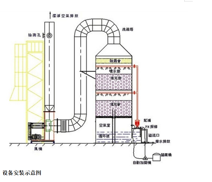 應(yīng)根據(jù)使用情況定期檢查塔體底部儲液池內(nèi)液體酸堿度、飽和度及排氣口氣體凈化程度,超過排放標準參數(shù)時,應(yīng)更換底部儲液池中或者沉淀池中的藥水吸收液。